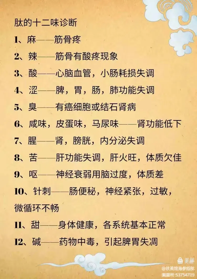不同的味道对应相应的脏器,一共有以下12种情况: