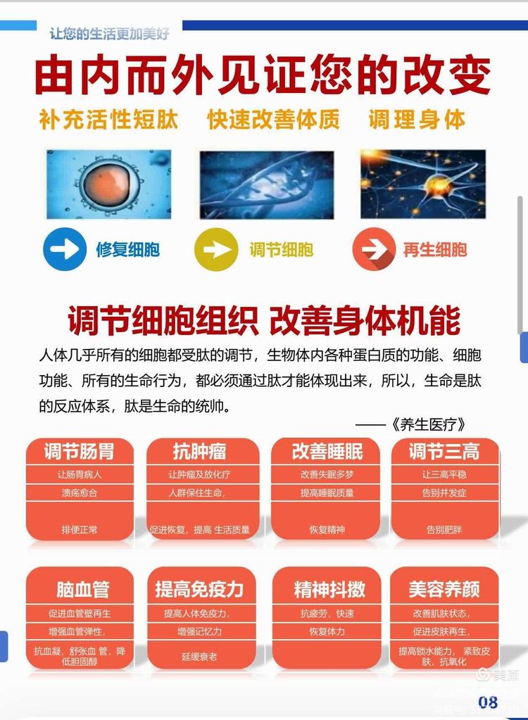 肽是构成人体细胞的基本材料,人体的一切核心物质都是以肽的形式存在,肽对于人体的作用,能够提供氨基酸的原料,帮助促进人体的蛋白质的合成。肽还能够起到胰岛素样或者激素样的作用,能起到一定的调节血糖、血脂或者刺激人的细胞组织生长的作用。还有抗菌肽能够起到一定的增强人体抵抗力,抵抗外来病原体感染的作用。肽由众多的氨基酸组成,氨基酸不仅能在人体内参与合成胶原,而且在大脑细胞中是一种中枢神经抑制性物质,能产生对中枢神经衰弱、失眠等症状的改善作用。